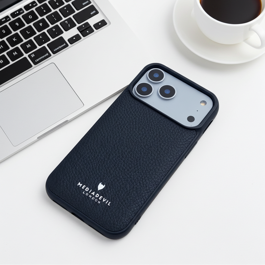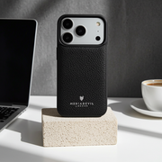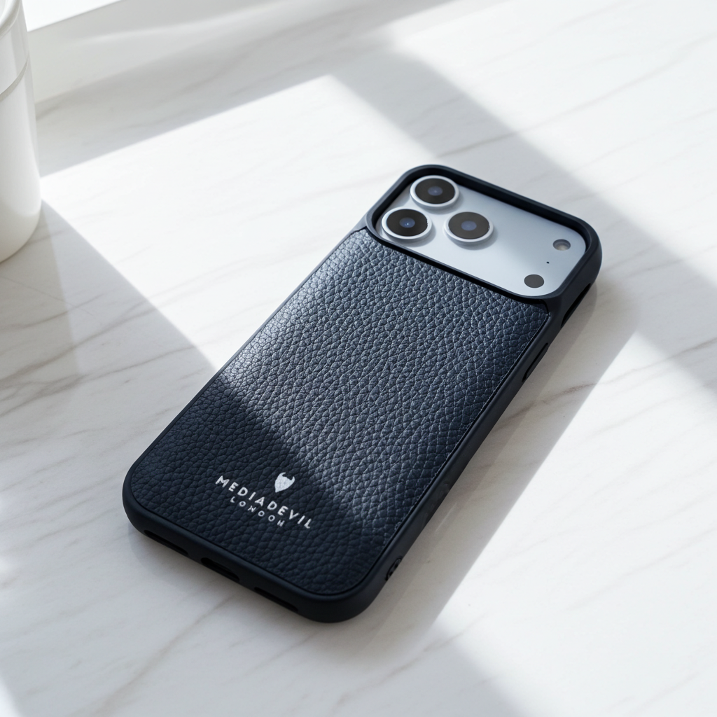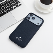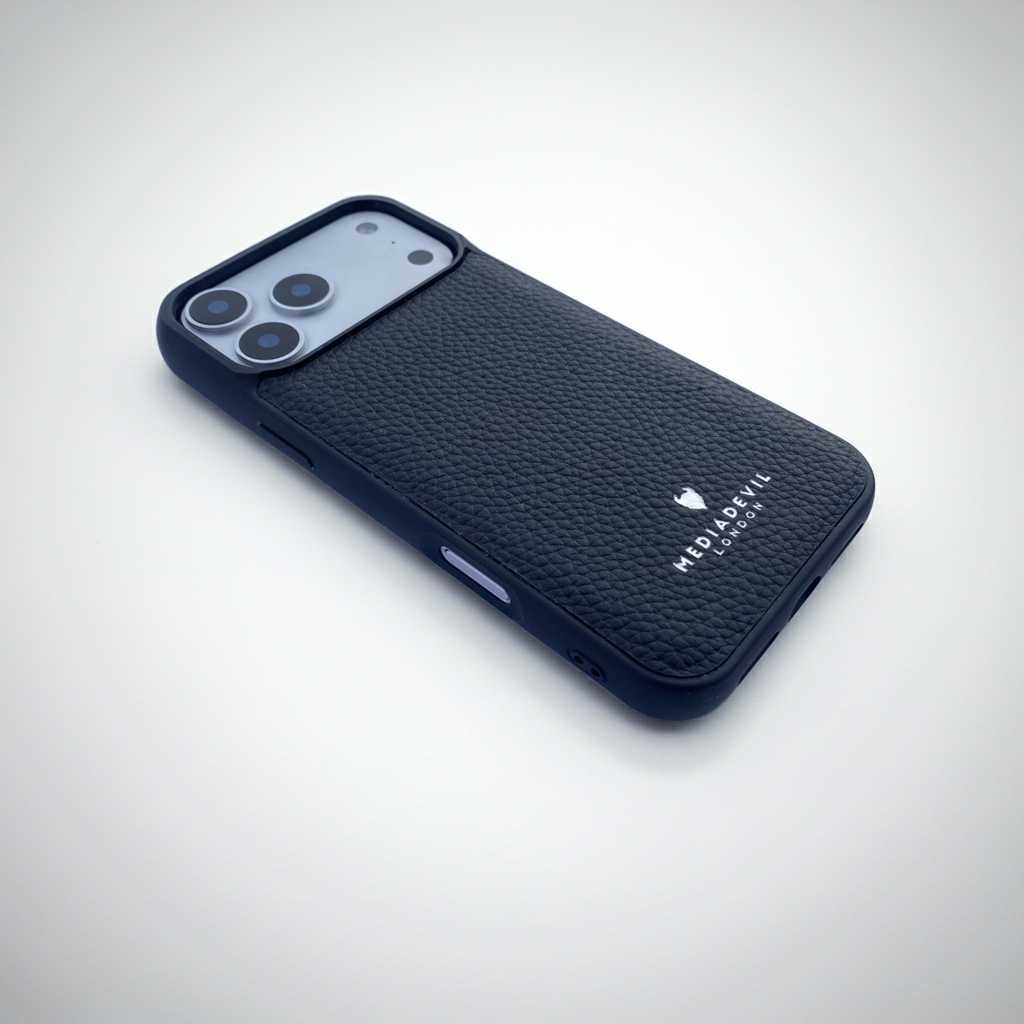 This matte-textured, rugged shock-absorbing case covers all sides of the iPhone 17 Pro Max. It is also slightly raised around the border of the main screen and the raised camera lens, for greater protection. It features an inlaid full-grain leather back and is wireless charging compatible and MagSafe compatible.